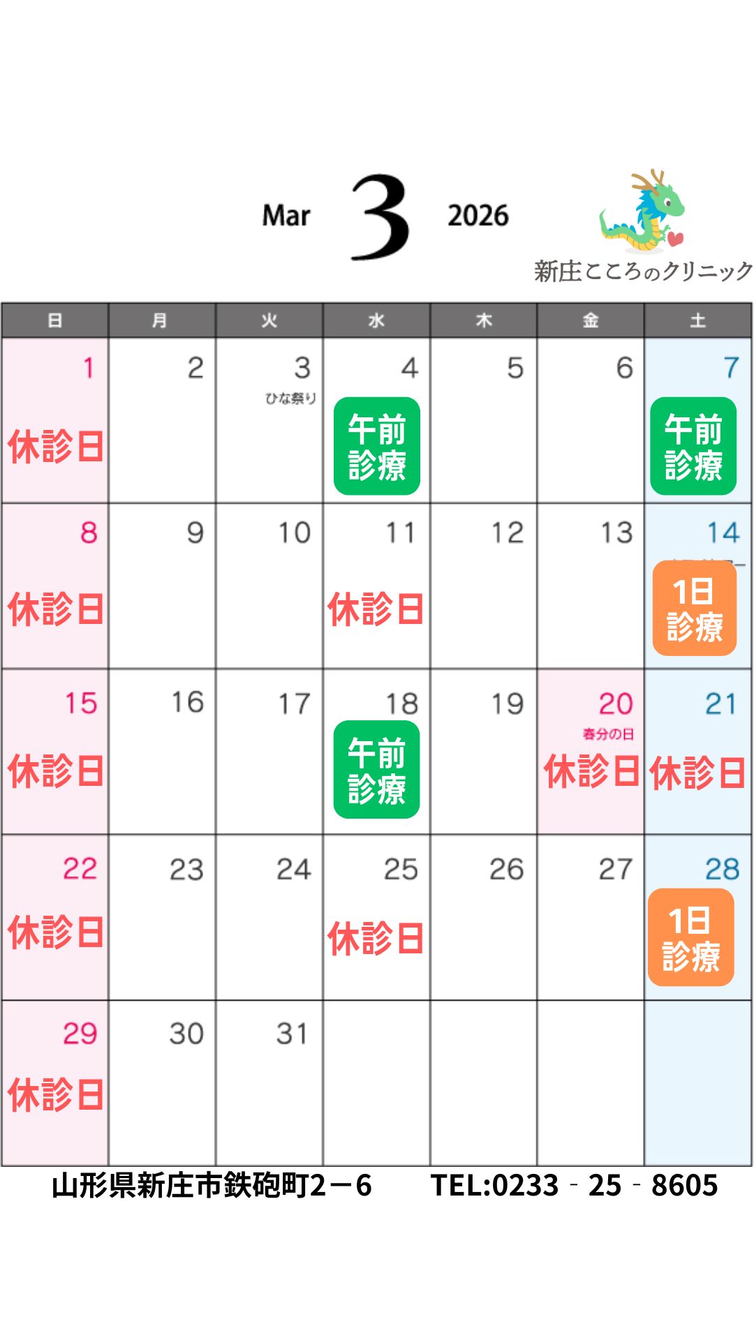 令和8年3月の診療日について、お知らせいたします。